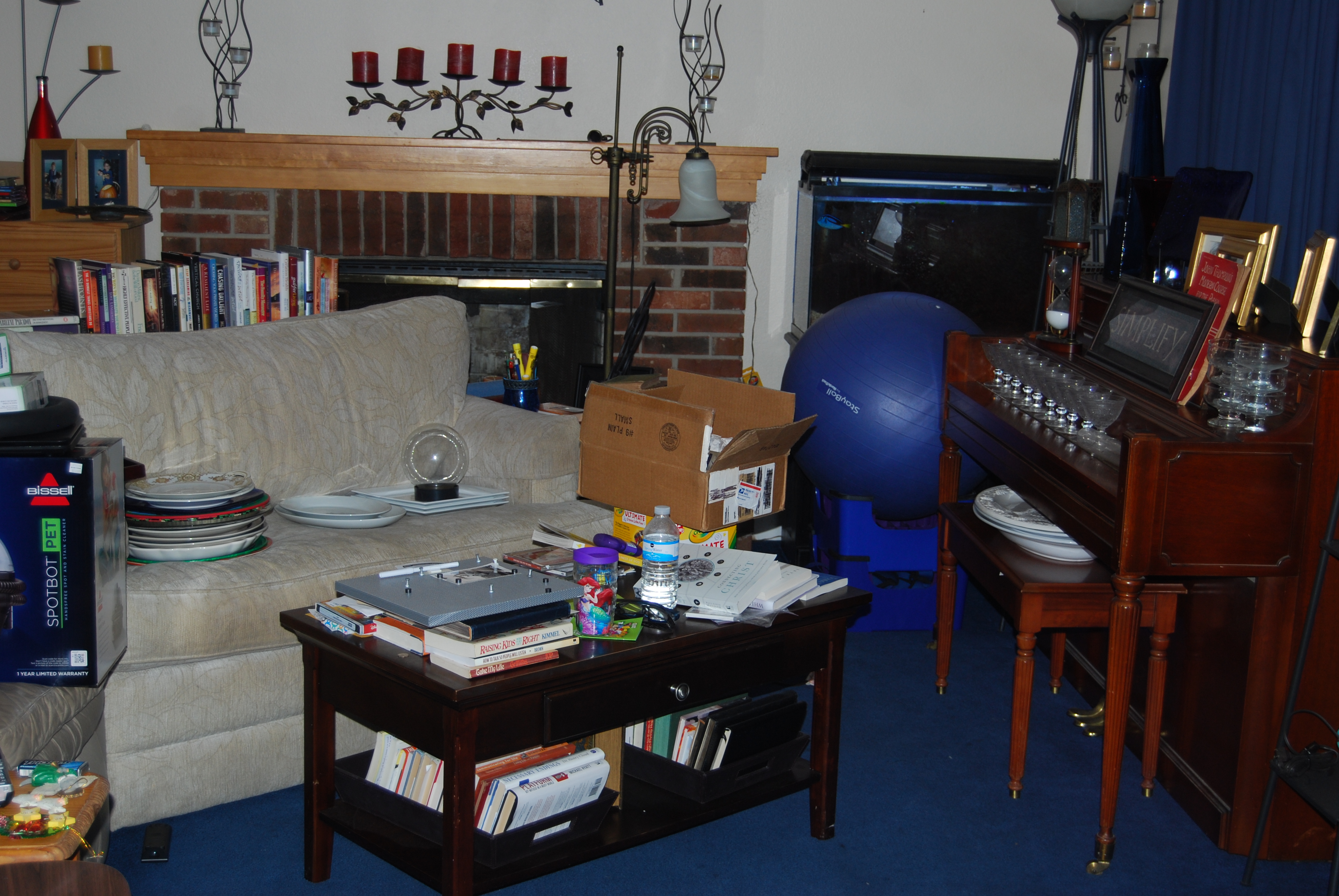 And a week later. Notice how much messier the family room looks after what at that point was over a month of continued home chaos. That’s paper shredder guts in the middle of the floor, but vacuuming just seemed so…pointless.