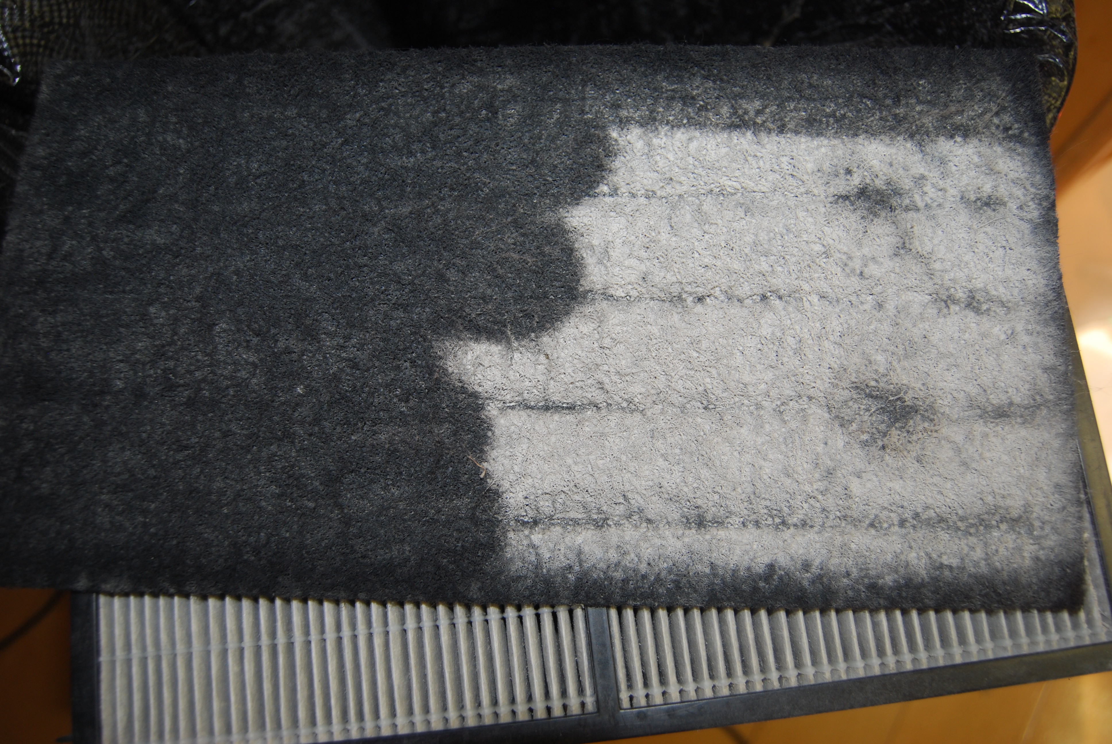 After the floor had been scraped, there was a fine layer of white powder EVERYwhere. On the walls, the curtains, the light bulbs…EVERYwhere. The air purifiers definitely helped. I took them apart to vacuum their filters. Here’s one mid-vacuum: